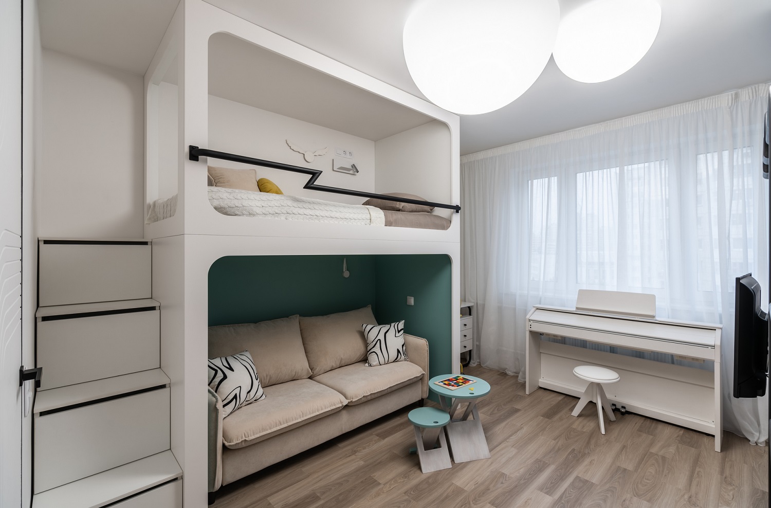 На полу — кварцевый ламинат Fargo Classic Дуб Бангкок 64W965: за такой пол не страшно даже в детской.